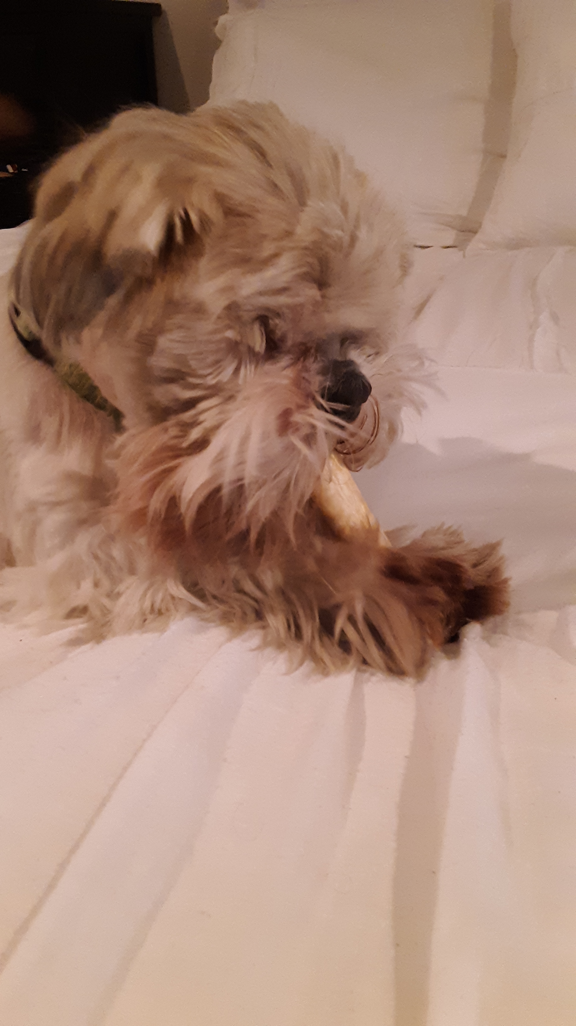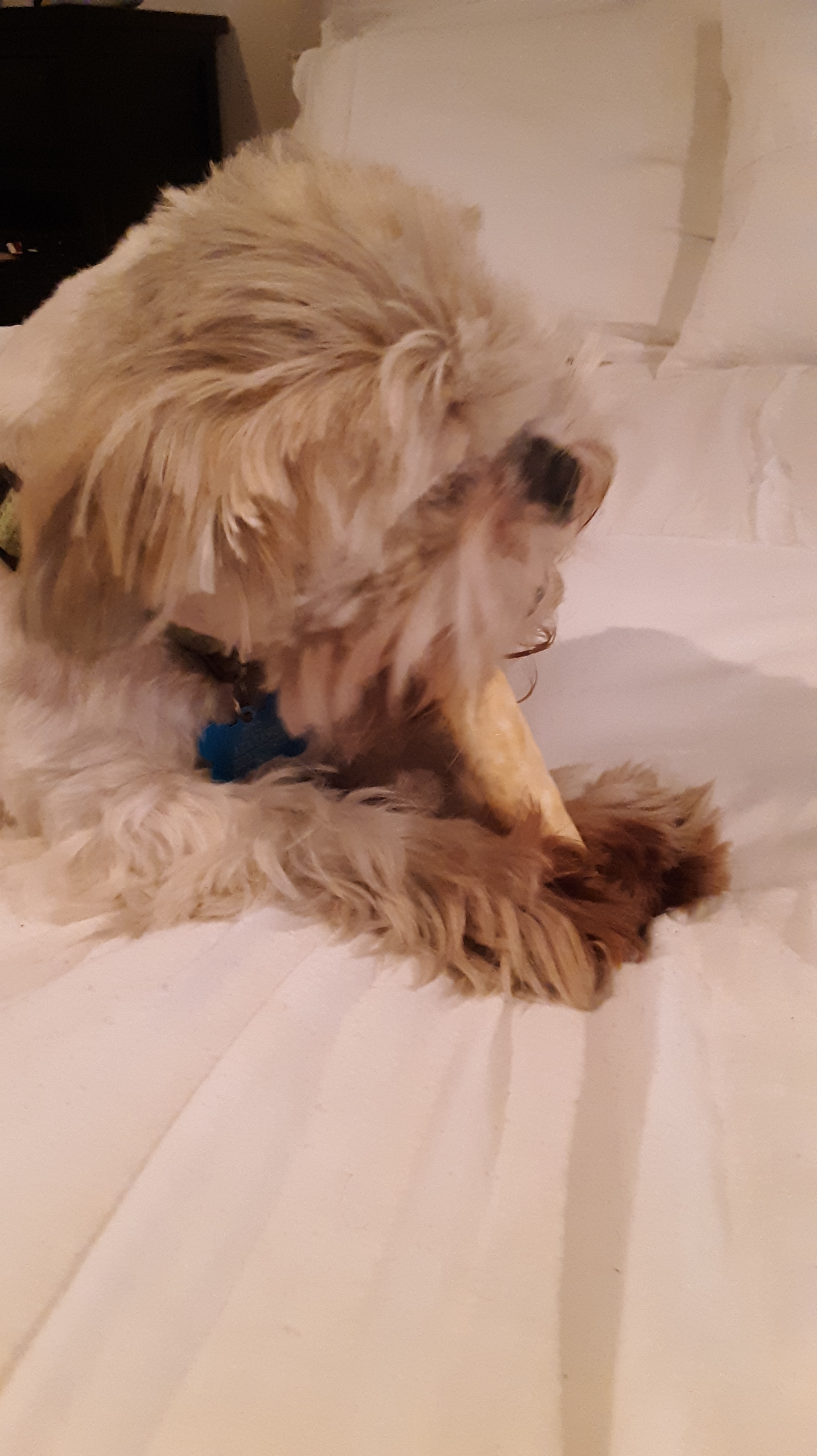 After dinner we did another potty trip and then into bed for some relaxing (and one of his new treats)….